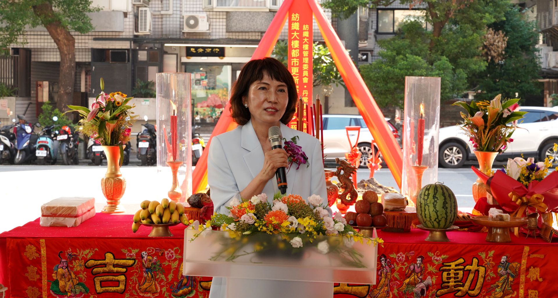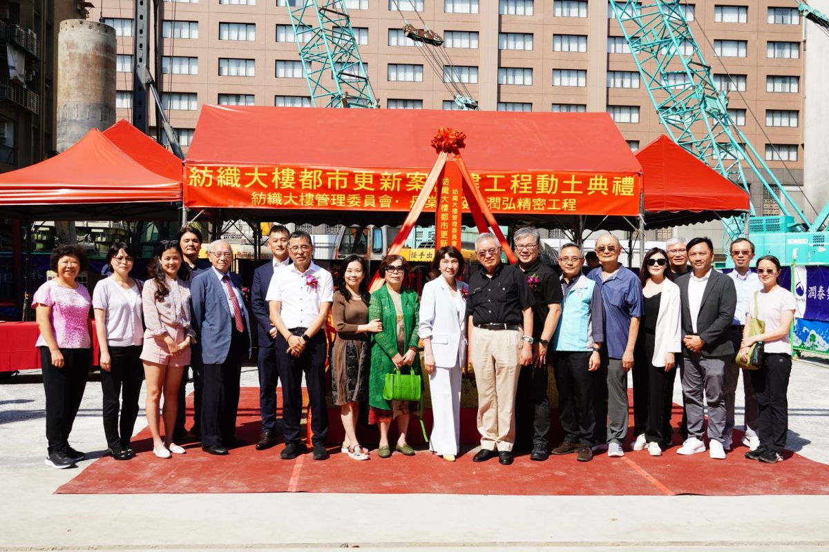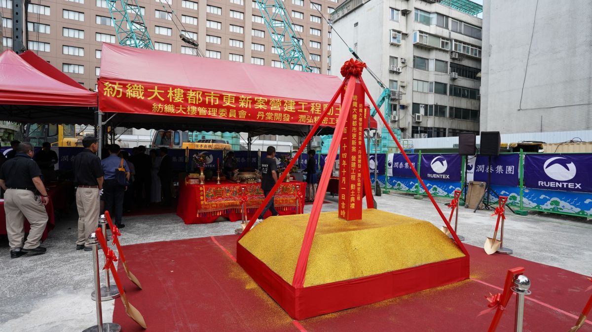 本案自今年3月順利完成營造發包,並在社區住戶及專業團隊的共同努力下完成拆除工程。今日,由蔡永興榮譽主委擔任主典者,並與社區紡織大樓管理委員會蔡惠娟主委、丹棠開發股份有限公司張志湧董事長、潤弘精密工程事業股份有限公司莫惟瀚總經理、 簡俊卿建築師、上海商業儲蓄銀行郭進一 總經理、吸引力綜合百貨股份有限公司戴春發董事長、台灣針織工業同業公會樓海鳴理事長等貴賓一同參與,共同見證並祝禱這場意義非凡的儀式。
