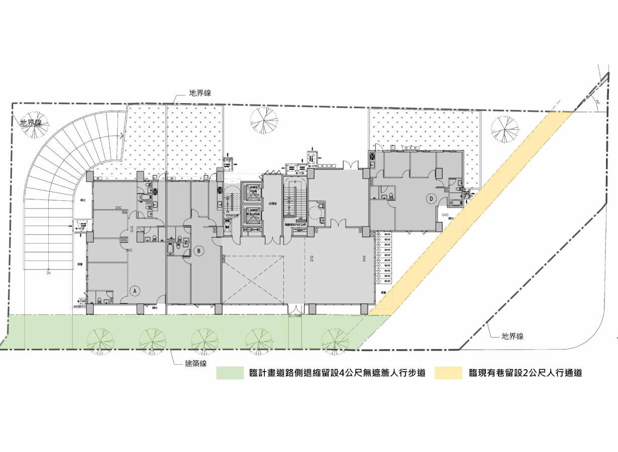 於景仁街82巷留設4公尺人行步道,臨現有巷則(景仁街)留設2公尺人行通道
