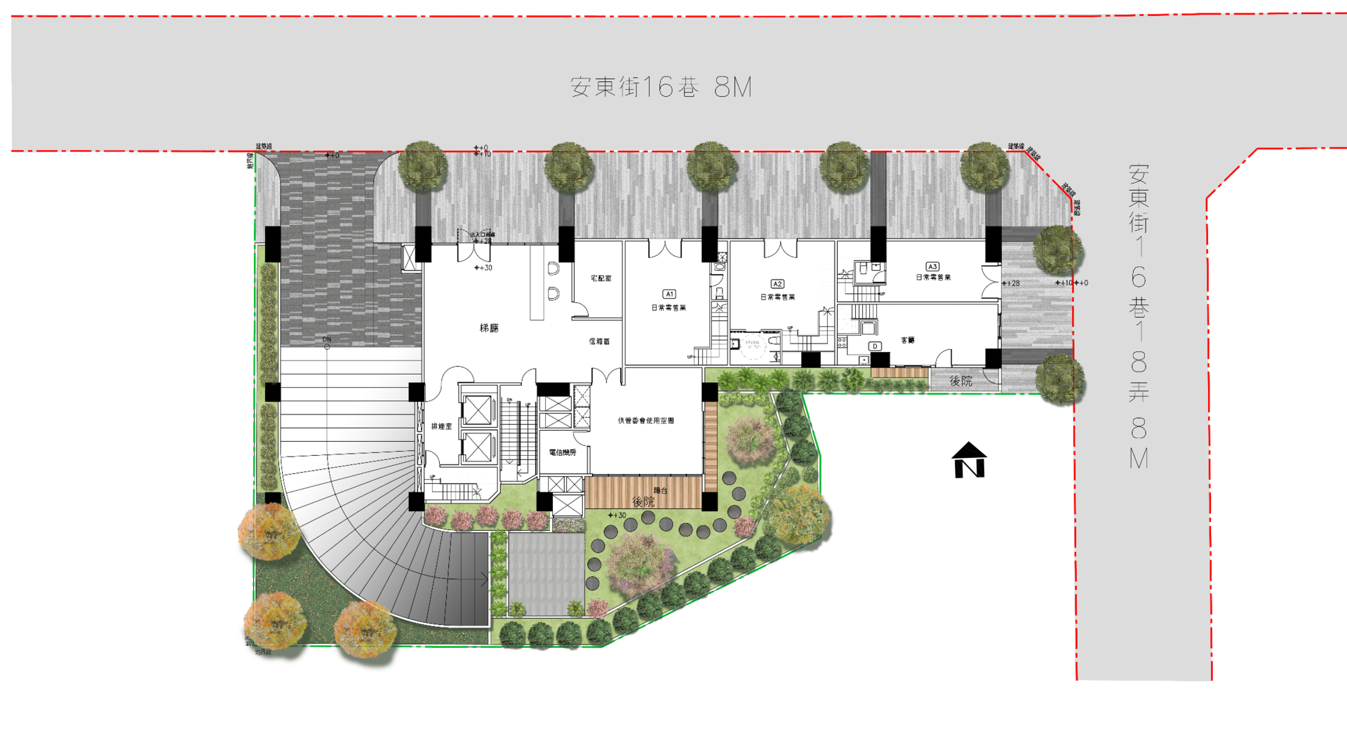建築量體集中設置,基地沿街面皆退縮留設4公尺無遮簷人行道,形塑舒適安全之人行空間。