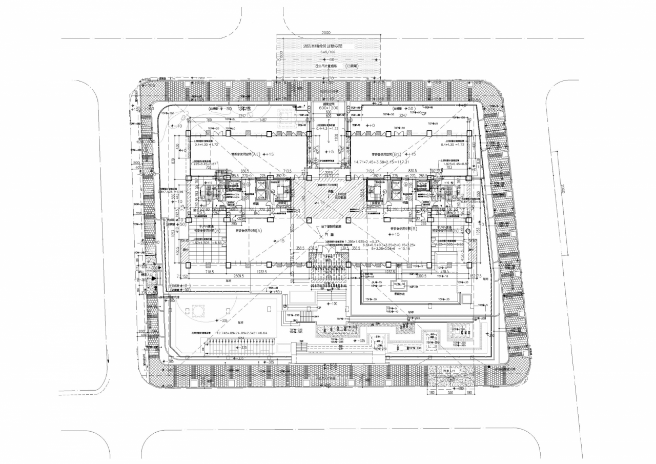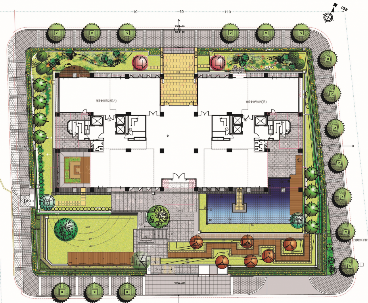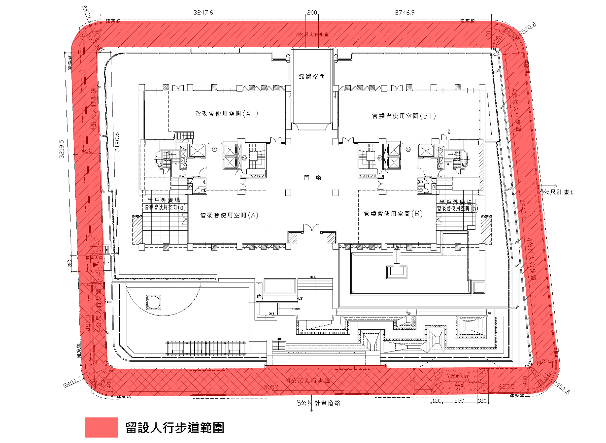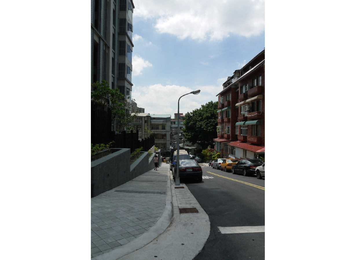 以低建蔽率規劃方式退縮建物,於基地四周留設四公尺人行步道空間。