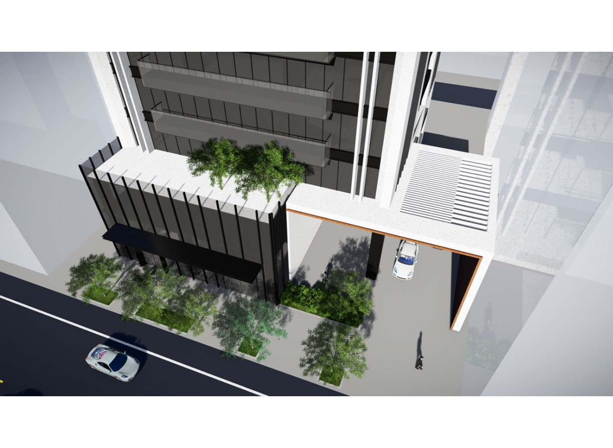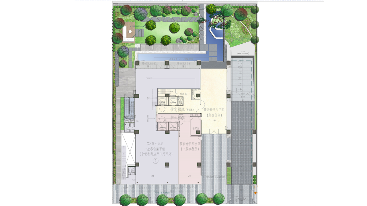 基地臨計畫道路側退縮5公尺人行步道,結合喬木植栽設計,美化都市景觀。